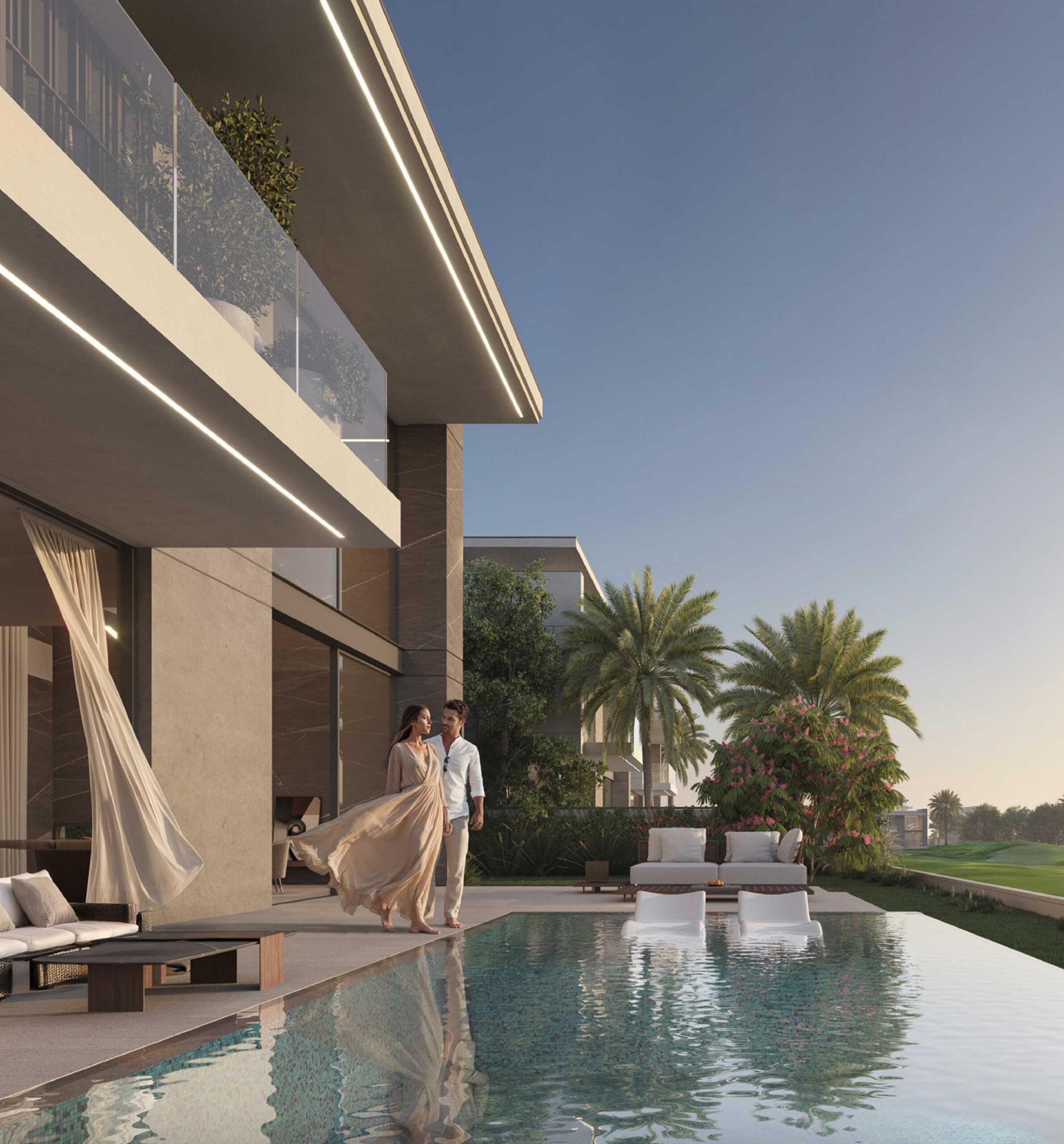 Prices start from AED 23.46 million (USD 640,000) with a flexible, investor friendly payment plan. Every villa includes a private swimming pool with landscaped courtyard, dedicated seating areas, a private lift serving all levels, and direct views of the championship golf course.